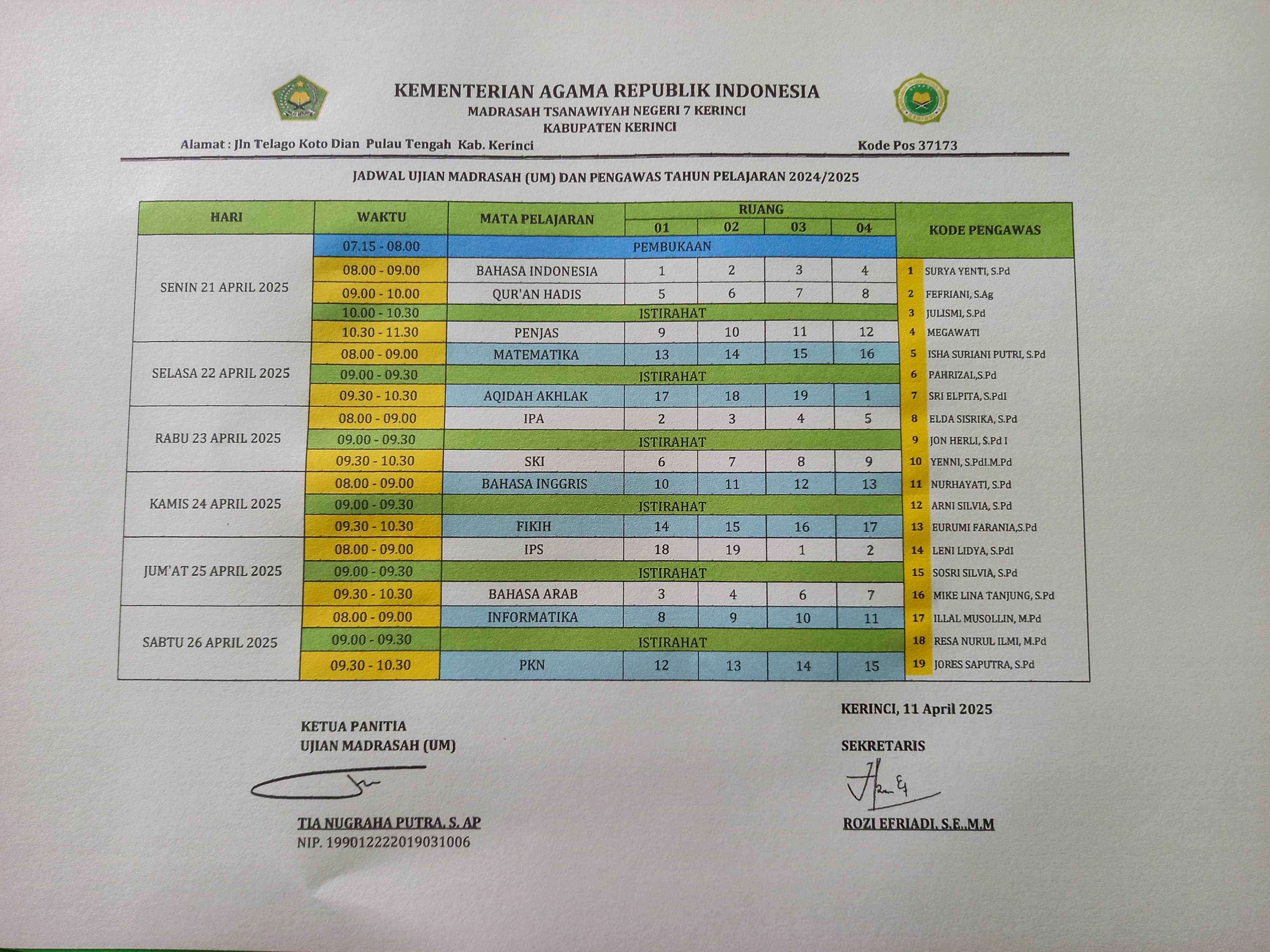 Pelaksana Ujian Madrasah (UM) Tia Nugraha Putra, S.AP selaku ketua panitia mengajak seluruh warga madrasah untuk menyukseskan Ujian Madrasah (UM) di MTsN 7 Kerinci.