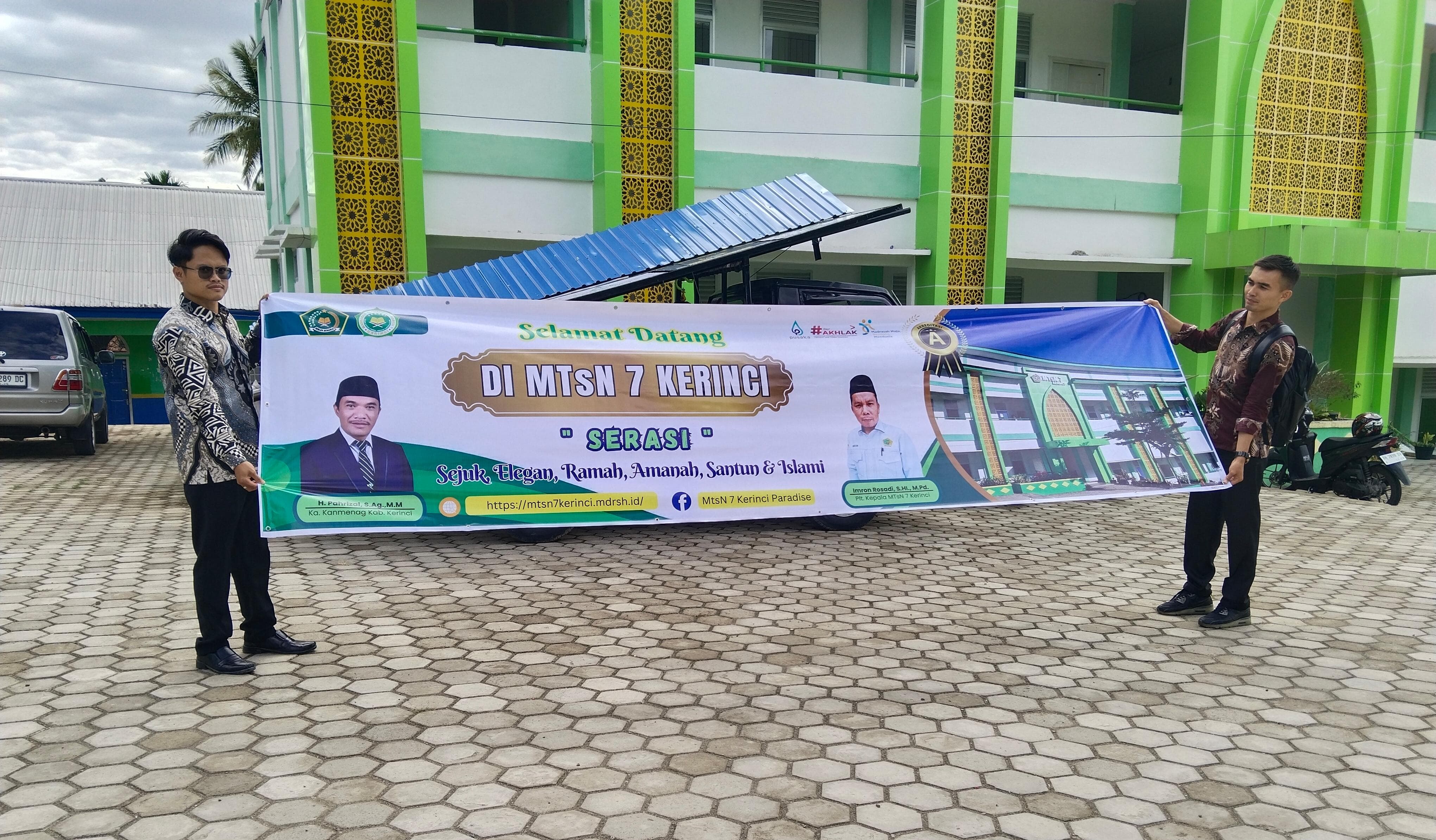 Dalam spanduk tersebut juga tergambar wajah Kepala Madrasah, Imron Rosadi, S.HI.,M.Pd yang menyambut para peserta didik dan orang tua dengan ramah. MTsN 7 Kerinci dikenal sebagai lembaga pendidikan yang mengedepankan nilai-nilai keislaman, kedisiplinan, serta integritas dalam pembentukan karakter siswa.