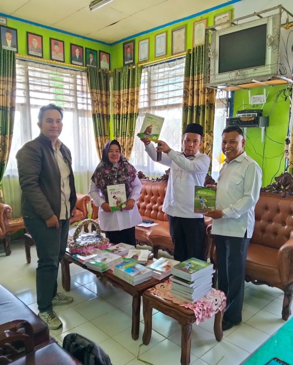 Kegiatan ini berlangsung di ruang kepala madrasah dan dihadiri oleh pihak madrasah, guru, serta perwakilan penerbit. Buku-buku yang diterima mencakup berbagai mata pelajaran seperti Fikih, Akidah Akhlak, dan lainnya.